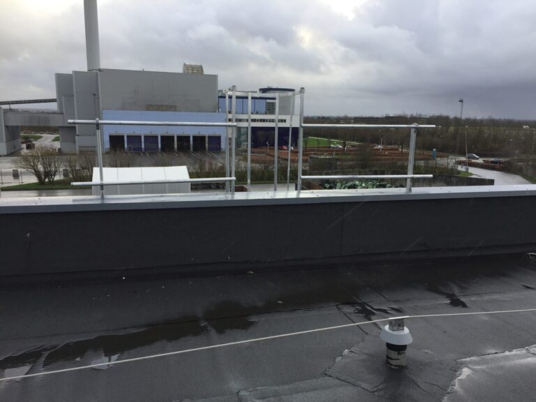 Ved udgang fra stige til tagoverfladen, monterede vi rækværk på begge sider af stigen. Dette for at sikre brugeren, indtil denne er koblet på tagets faldsikringssystem.