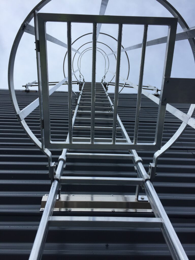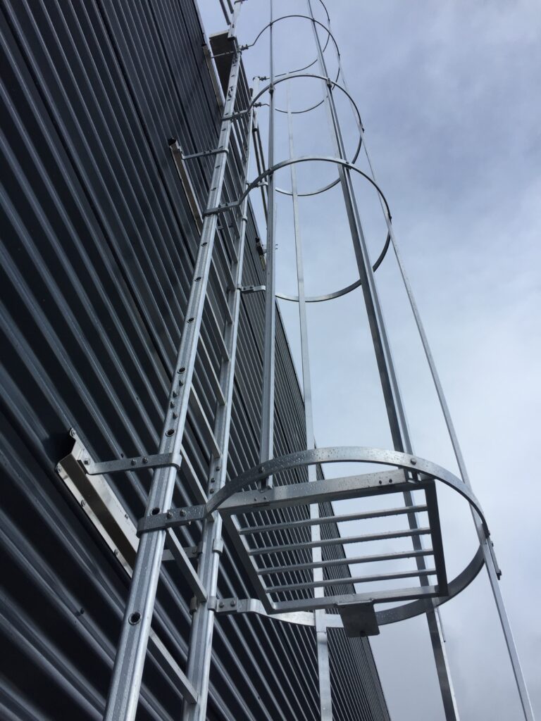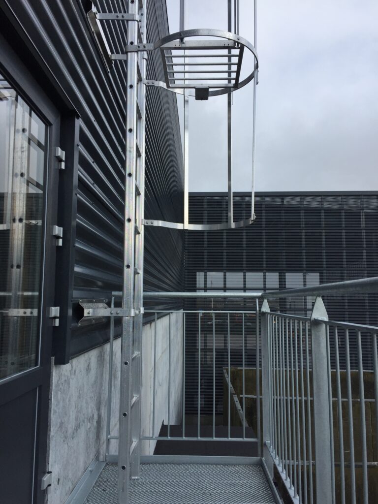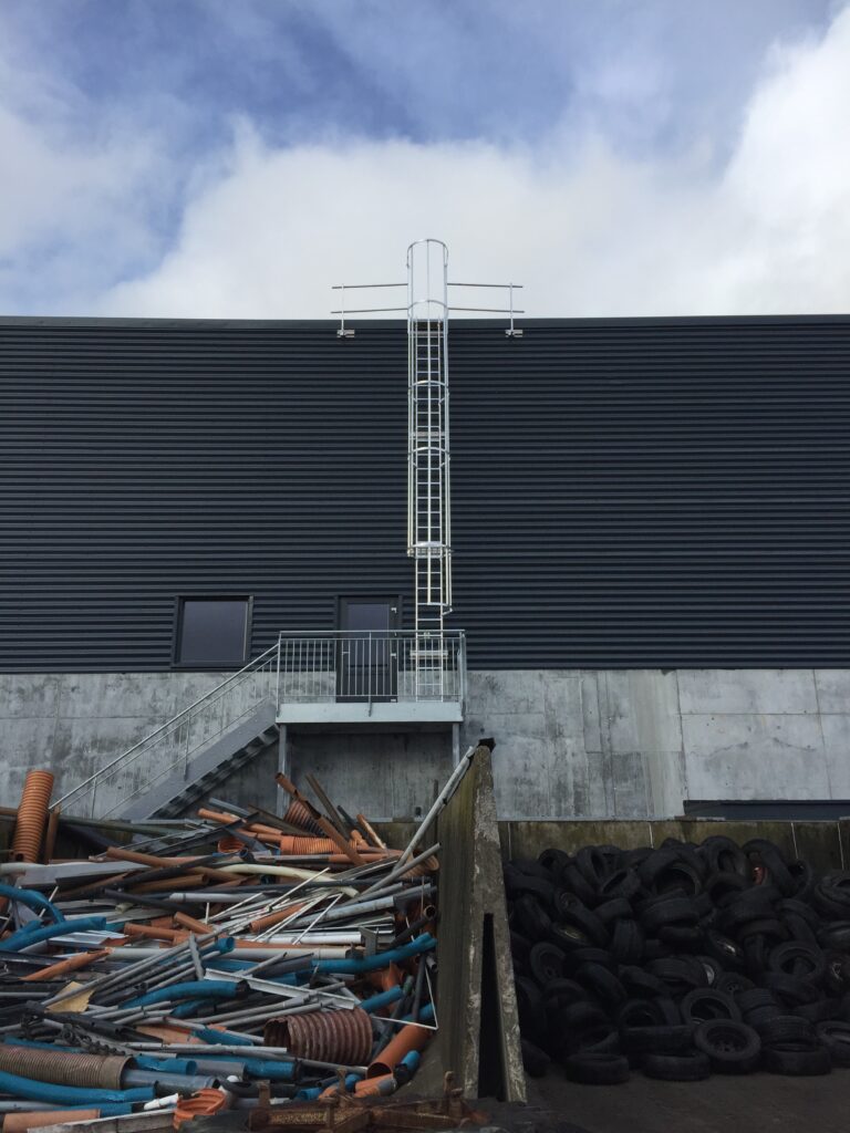 I Holstebro har vi leveret en adgangsløsning til en ny sorteringshal. Kravet var, at man skulle have adgang fra en trapperepos til taget. Derfor valgte vi at montere en vægstige, hvor rygbøjlen er forlænget i højre side. Dermed sikres brugeren mod et fald ud over kanten.