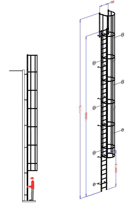 Til vægstigen er der jfr. kravet i EN 14 122 godkendte rygbøjler og en bred udstigningssektion. Dette er standard på alle vore stiger og stiger fra 9 meter kommer ligeledes med en godkendt hvileplatform.